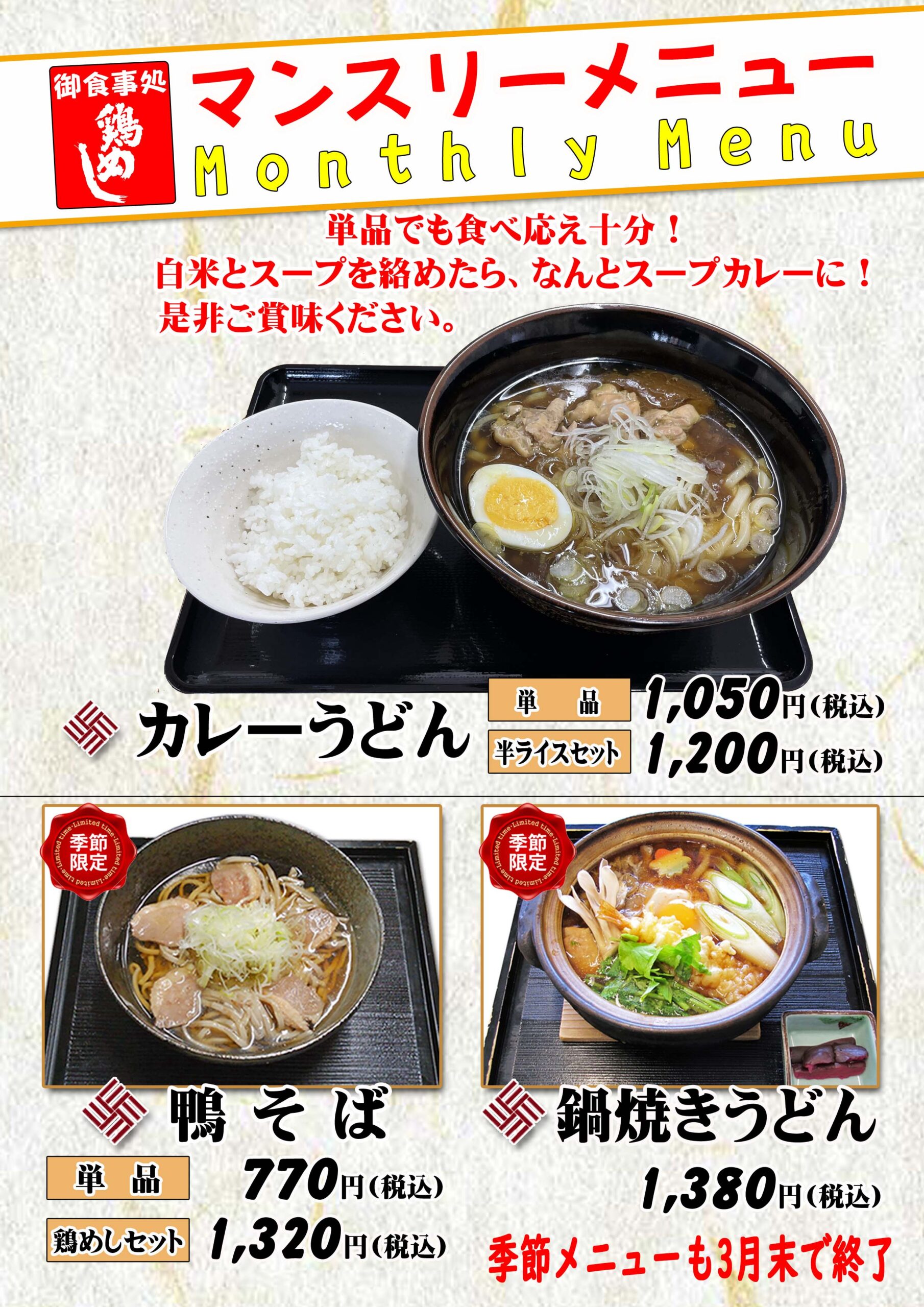 御食事処より3月マンスリーメニューのお知らせ! 2026-03-02 | お知らせ 3月マンスリーメニュー ■カレーうどん 単品1,050円(税込)/半ライスセット1,200円 白米と組み合わせたら、珍しいスープカレーで召し上がれます。 人気の季節メニュー「鴨そば」、「鍋焼きうどん」は3月末で終了です。